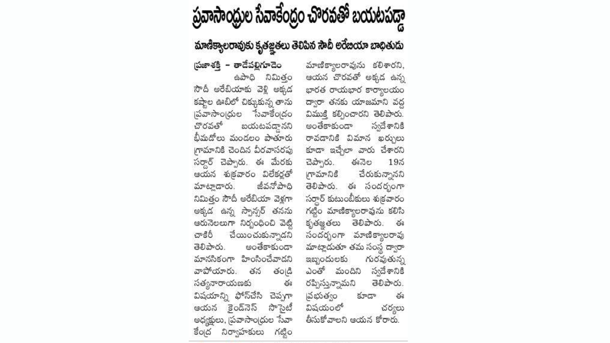 కైండ్నెస్ ఆంధ్ర మైగ్రెంట్స్ సర్వీస్ సెంటర్ సహాయంతో మరియు గొప్ప ప్రయత్నాలతో సర్దార్ వీరవాసరపు సౌదీ అరేబియా నుండి భారతదేశానికి సురక్షితంగా తిరిగి రావడం.